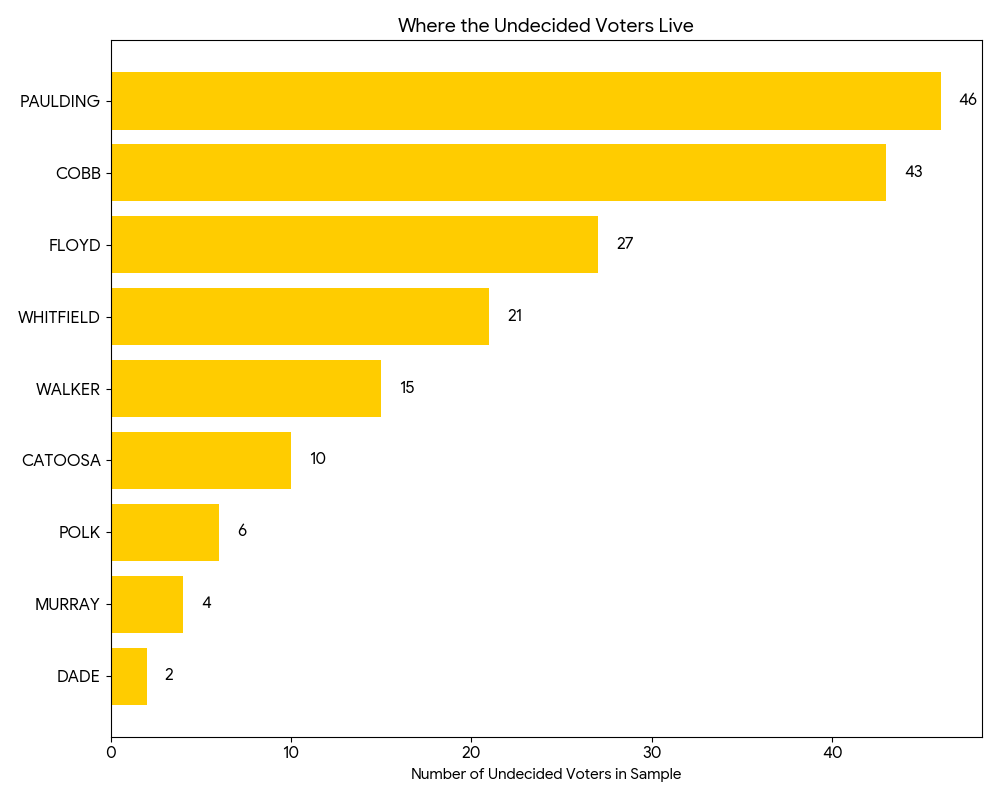 Perhaps the most significant finding is that 24.2% of voters remain undecided. This group represents the single largest "bloc" of voters after Shawn Harris. Notably, these undecided voters are concentrated in the suburban corridors of Paulding and Cobb Counties.
